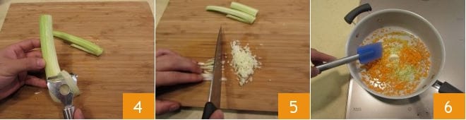 Faites de même avec la branche de céleri, mais d'abord, retirez la partie externe filandreuse à l'aide d'un économe 4. Coupez également en dés 5. Dans une casserole, versez l'huile avec les petits dés de carotte et céleri et ajoutez également la gousse d'ail épluchée, en laissant cuire le tout à feu vif pendant 7-8 minutes, en remuant de temps en temps pour éviter que les légumes ne brûlent ou ne collent au fond 6.