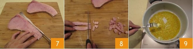 Pendant ce temps, retirez la peau des tranches d'espadon 7 puis passez à la découpe : pour un effet plus original, vous pouvez couper l'espadon en gros dés ou en petits cubes d'une épaisseur d'environ 3-4 mm 8. Retirez la gousse d'ail du soffritto 9