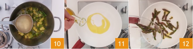 Mélangez et laissez cuire pendant 5 minutes à feu doux en remuant de temps en temps, ajoutez le bouillon filtré 10, portez à ébullition, réduisez le feu au minimum et faites cuire pendant 15 minutes, à mi-cuisson ajustez le sel et ajoutez une pincée de poivre. Pendant ce temps, dans une poêle, chauffez un filet d'huile 11, ajoutez les pointes d'asperges 12 et faites-les sauter pendant 2-3 minutes.