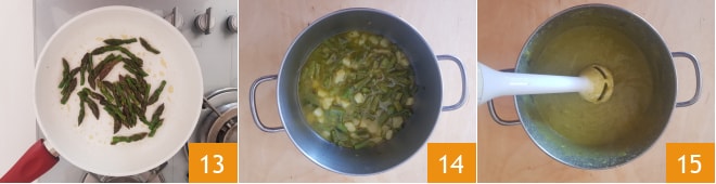 Puis éteignez le feu 13 et réservez-les. Entre-temps, les asperges et les pommes de terre seront cuites 14, mixez le tout avec un mixeur plongeant pour obtenir une crème fluide et homogène 15.