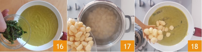 Transférez la crème d'asperges dans une sauteuse spacieuse, ajoutez également 1/3 des pointes d'asperges 16. Mettez sur le feu une casserole remplie d'eau, portez-la à ébullition, ajoutez le sel et faites cuire ici les gnocchi frais 17. Il ne faudra que quelques minutes, le temps qu'ils remontent à la surface. Égouttez-les au fur et à mesure dans la sauce réchauffée 18.