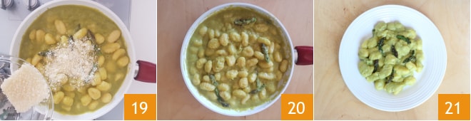 Assaisonnez avec le fromage râpé 19, mélangez délicatement pour homogénéiser 20 et servez immédiatement les gnocchi à la crème d'asperges en garnissant les assiettes avec les pointes restantes 21.