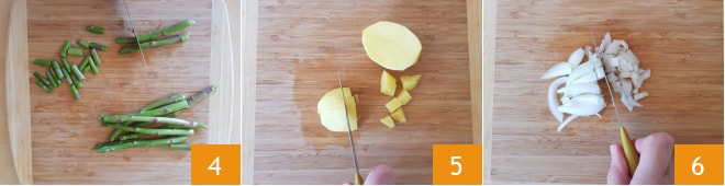 Réduisez le reste de la tige en morceaux de 2 ou 3 cm 4. Épluchez les pommes de terre et coupez-les en dés 5. Épluchez et hachez l'oignon 6.