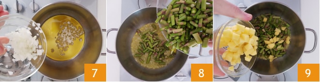 Chauffez un généreux filet d'huile dans une casserole et faites légèrement blondir l'oignon 7, puis ajoutez les tiges d'asperges 8 et les dés de pommes de terre 9.