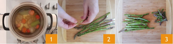 Pour réaliser les gnocchi à la crème d'asperges, commencez par préparer le bouillon de légumes et gardez-le au chaud 1. Occupez-vous ensuite de la sauce : nettoyez les asperges en éliminant la partie finale de la tige qui serait dure 2. Coupez les pointes 3 et réservez-les.