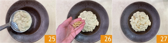 Disposez les gnocchis dans les assiettes 25, en les complétant avec une pincée de parmesan et quelques noix émiettées 26. Servez-les bien chauds 27.