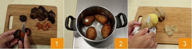 Pour préparer les gnocchis de prunes, commencez par prendre les prunes et les dénoyauter avec un couteau 1. Si vous utilisez des prunes séchées assez sèches, mettez-les à tremper dans de l'eau tiède pour les réhydrater, puis pressez-les délicatement et seulement ensuite dénoyautez-les. Une fois cette étape terminée, mettez les prunes de côté. Lavez bien les pommes de terre sous l'eau fraîche courante et faites-les cuire entières avec la peau dans une grande quantité d'eau salée 2. Après 40-45 minutes, vérifiez la cuisson des pommes de terre en les piquant avec une fourchette ; si les pommes de terre sont tendres et bien cuites, éteignez le feu et égouttez-les délicatement ; puis épluchez-les encore chaudes 3.