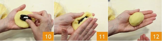 Divisez la pâte en 12 parts égales de 60 g chacune et formez des boules que vous écraserez ensuite dans la paume de vos mains, obtenant ainsi des disques. Une fois cette étape terminée, placez au centre de chaque disque une prune dénoyautée dans laquelle vous placerez à son tour un demi-sucre (ou une petite cuillère de sucre) 10. Fermez délicatement chaque disque avec les mains 11 jusqu'à former des boules de même taille 12.