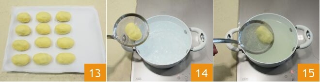 Répétez l'opération et, lorsque vous aurez terminé, placez les gnocchis de prunes obtenus sur un plateau recouvert de papier sulfurisé 13. Lorsque l'eau aura atteint l'ébullition, faites cuire les gnocchis 14 et égouttez-les au fur et à mesure qu'ils remontent à la surface 15 ;