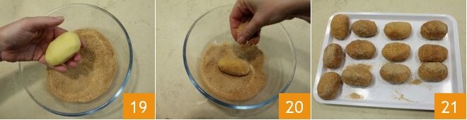 Passez délicatement les gnocchis de prunes dans la panure obtenue 19, en s'assurant qu'elle adhère bien de manière uniforme 20. Répétez l'opération et placez les gnocchis panés sur un plateau 21.