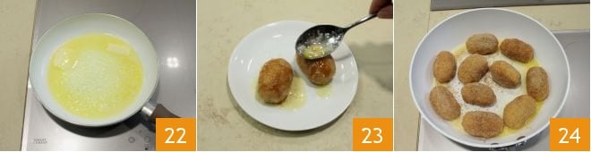Enfin, mettez sur le feu une poêle antiadhésive avec le beurre 22 ; une fois fondu, vous pouvez décider de saupoudrer les gnocchis de prunes avec le beurre fondu 23 ou de les faire sauter dans la poêle jusqu'à ce qu'ils soient bien dorés 24. Une autre variante consiste à faire dorer la chapelure avec le beurre et la cannelle, puis à y plonger les gnocchis, en les faisant sauter quelques secondes pour les parfumer. Servez les gnocchis de prunes bien chauds.