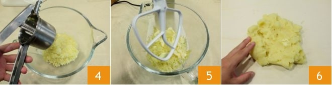 Passez-les ensuite au moulin à légumes ou avec un presse-purée 4 et mettez la purée dans le robot culinaire. Ajoutez le beurre à température ambiante en petits morceaux et actionnez la feuille 5 (si vous n'avez pas de robot culinaire, travaillez la pâte sur un plan de travail avec les mains) ; lorsque vous aurez obtenu un mélange homogène, transférez la purée de pommes de terre sur un plan de travail 6.