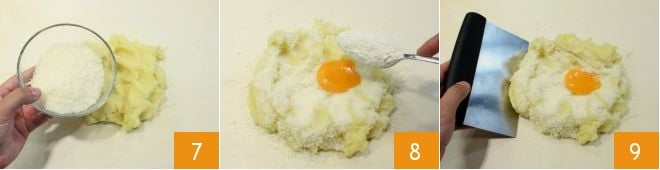Ajoutez ensuite le parmesan râpé 7, le jaune d'œuf et la farine 8 ; mélangez le tout délicatement avec une spatule pendant 5-6 minutes au maximum sans trop pétrir 9, jusqu'à obtenir une pâte souple et consistante. Si la pâte est trop molle ou collante, ajoutez une autre cuillère à soupe de farine (le résultat dépend beaucoup du type de pommes de terre que vous avez utilisé). Pendant ce temps, mettez sur le feu une casserole avec beaucoup d'eau salée, qui servira à la cuisson des gnocchis.