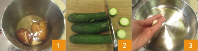 Pour préparer les gnocchis de courgettes, commencez par faire bouillir les pommes de terre pendant environ 50 minutes ou jusqu'à ce qu'elles soient tendres 1. Testez la cuisson avec les dents de la fourchette pour mieux vous ajuster. En attendant, lavez les courgettes, coupez les extrémités et tranchez-les en rondelles 2, vous obtiendrez ainsi environ 515 g. Dans une poêle, versez l'huile et l'ail 3, laissez parfumé quelques instants,