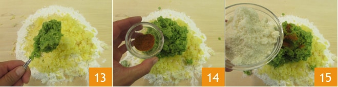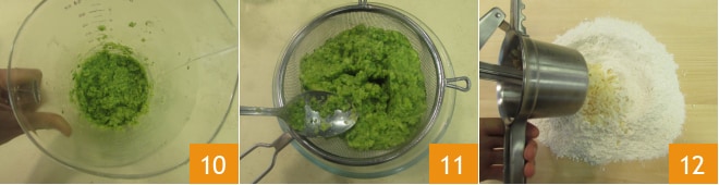 pour créer une purée 10, puis passez-la au tamis 11 et mettez-la de côté pour qu'elle refroidisse. Maintenant, versez la farine sur le plan de travail, ajoutez les pommes de terre cuites, désormais froides, passées au presse-purée 12.