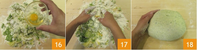 Pour finir, incorporez l'œuf entier 16. Pétrissez énergiquement 17 jusqu'à obtenir une pâte homogène 18.