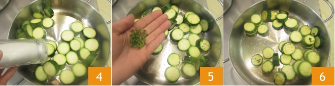 puis ajoutez les courgettes. Salez 4, poivrez, aromatisez avec les feuilles de thym 5 et faites cuire les courgettes pendant environ 10 minutes à feu moyen, ou jusqu'à ce qu'elles soient cuites. Le temps varie en fonction de la taille des courgettes 6.