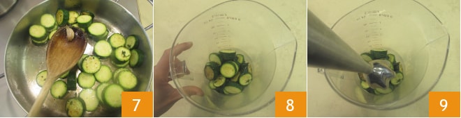 Ôtez l'ail 7, versez les courgettes dans un verre à bord haut 8 et mixez avec le mixeur plongeant 9,