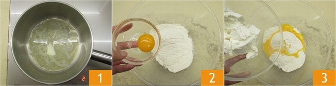 Pour réaliser les gnocchis de fruits tchèques (knedliky), commencez par faire fondre le beurre dans une casserole et laissez-le refroidir 1. Pendant ce temps, versez la farine dans un bol avec le jaune d'œuf 2 et la ricotta 3.
