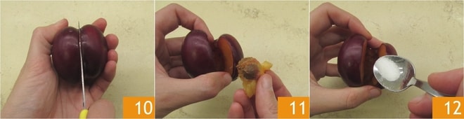 À ce stade, lavez les prunes, incisez un côté 10 et retirez le noyau, en gardant le reste du fruit entier 11. Remplissez la cavité centrale avec une cuillère à café de sucre 12, puis refermez le fruit.