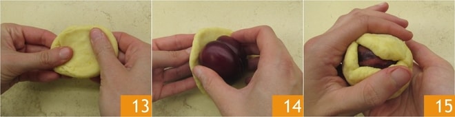 Reprenez les boules de pâte et étalez-les avec les doigts pour créer des disques d'épaisseur uniforme 13. Enveloppez le disque de pâte autour de la prune 14 jusqu'à la recouvrir entièrement 15.