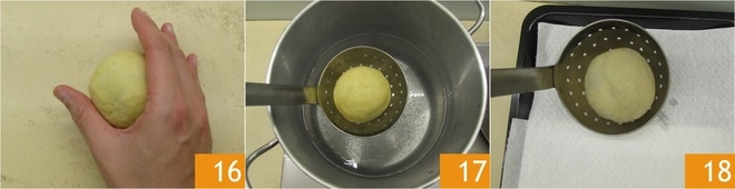 Roulez la boule sur le plan de travail pour la rendre lisse et uniforme 16. Pendant que vous répétez la même opération avec le reste des prunes, portez à ébullition une casserole d'eau légèrement salée. Plongez les gnocchis à l'aide d'une écumoire 17 et laissez mijoter environ 5 minutes, sans jamais remuer. Lorsqu'ils remontent à la surface, égouttez les gnocchis et transférez-les sur du papier absorbant 18.