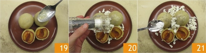 Garnissez les knedliky avec du beurre fondu à votre convenance 19, un peu de ricotta émiettée, des graines de pavot moulues 20 et du sucre glace 21 : vos gnocchis de fruits tchèques sont prêts à être dégustés !