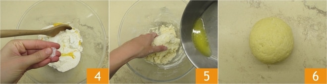 Ajoutez une pincée de sel 4 et commencez à mélanger les ingrédients avec une cuillère en bois, puis ajoutez le beurre fondu 5 et continuez à mélanger. Transférez le mélange sur le plan de travail fariné et pétrissez pendant 5 minutes jusqu'à obtenir une boule ferme et lisse 6. Si la pâte est trop liquide, vous pouvez ajouter un peu de farine, sinon une goutte de lait.