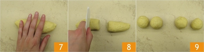 Farinez le plan de travail et divisez la pâte en deux, puis formez 2 boudins 7. Divisez chaque boudin en 5 parties 8 et formez des boules 9.