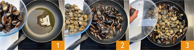 Pour préparer les gnocchis aux fruits de mer, vous pouvez commencer par le nettoyage des moules et nettoyage des palourdes. Ensuite, dans une grande casserole ou poêle, versez l'huile, la gousse d'ail entière et les moules 1. Ajoutez également les palourdes 2 et laissez-les s'ouvrir en couvrant avec le couvercle 3, en remuant de temps en temps la poêle. Cela prendra très peu de temps.
