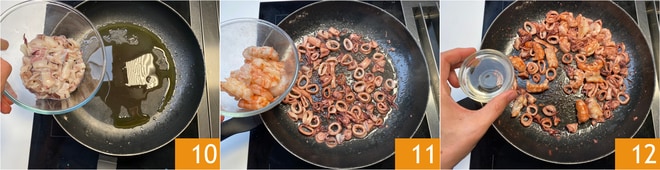 Versez un filet d'huile dans la même poêle qu'avant, ajoutez les calamars 10 et faites-les revenir quelques instants en salant et en mélangeant avec la cuillère en bois ; ils doivent juste se saisir. Ensuite, ajoutez les crevettes 11 et faites-les revenir également quelques instants avant de déglacer avec du vin blanc 12.