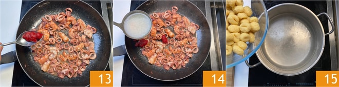 Une fois l'alcool évaporé, vous pouvez ajouter le concentré de tomate 13, délayez avec de l'eau de cuisson, puis mélangez et vous êtes prêts à faire cuire les gnocchis (pour le temps nécessaire indiqué sur l'emballage) 15.