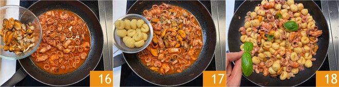 Les derniers instants de cuisson, ajoutez les moules et les palourdes à la sauce de calamars et crevettes 16, éteignez le feu et égouttez les gnocchis directement dans la poêle 17, aromatisez avec du poivre selon votre goût et des feuilles de basilic frais 18 et assaisonnez avec un filet d'huile à cru. Les gnocchis aux fruits de mer sont prêts à être servis !