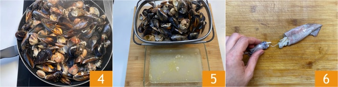Une fois ouvertes 4, vous pouvez les égoutter et verser le liquide filtré dans une casserole en ajoutant suffisamment d'eau pour faire bouillir ensuite les gnocchis 5. Procédez à décortiquer les moules et les palourdes (vous pouvez en garder quelques-unes entières pour décorer les assiettes). Ensuite, prenez les calamars, déjà nettoyés et dépourvus de peau, détachez la tête et gardez les tentacules 6.