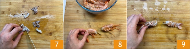 Retirez les yeux et coupez en rondelles le manteau 7, puis réduisez en morceaux les tentacules. Passez aux crevettes : retirez la tête 8, la carapace 9 et l'intestin.