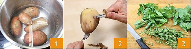 Pour préparer les gnocchis aux herbes avec crème de poireaux, lavez et faites cuire les pommes de terre 1, entières et encore avec la peau, pendant environ une demi-heure dans de l'eau salée (si vous voulez utiliser une cocotte-minute, cela prendra environ 15 minutes). Passé ce temps, vérifiez la cuisson des pommes de terre, puis égouttez-les, laissez-les légèrement refroidir et épluchez-les encore chaudes 2. Passez-les au tamis (ou dans un presse-purée) en laissant tomber la purée directement sur un plan de travail ou dans un grand bol. Hachez finement les herbes aromatiques (basilic, persil, ciboulette, thym) 3