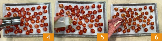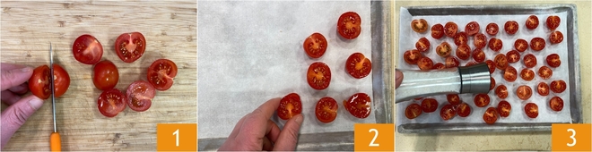 Pour préparer les gnocchis à la sauce de tomates cerises rôties, commencez par les tomates cerises. Lavez-les, essuyez-les et coupez-les en deux 1. Disposez-les sur une plaque recouverte de papier cuisson, face coupée vers le haut 2, puis assaisonnez-les d’une pincée de sel 3.