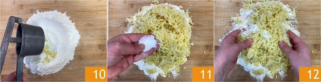 Écrasez les pommes de terre chaudes directement sur la farine, il ne sera pas nécessaire de les peler 10. Ajoutez le sel 11 et pétrissez rapidement avec les mains 12.
