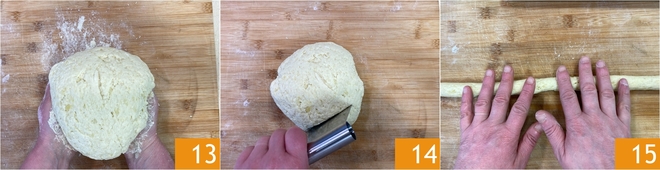 Vous devez obtenir une pâte homogène 13, en faisant attention à ne pas trop la travailler pour éviter que les gnocchis deviennent durs. Divisez la pâte en portions 14 et formez des boudins d’environ 2 cm d’épaisseur 15.