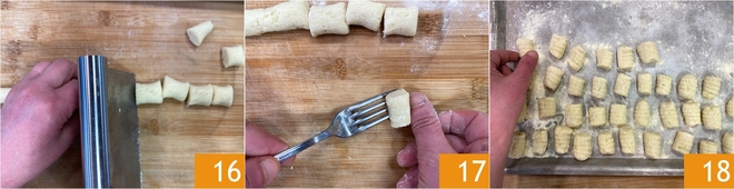 Puis coupez les gnocchis en petits morceaux 16. Passez chaque gnocco sur les dents d’une fourchette 17 ou sur un outil à gnocchis pour obtenir les rainures classiques, et disposez-les au fur et à mesure sur une plaque farinéee 18.