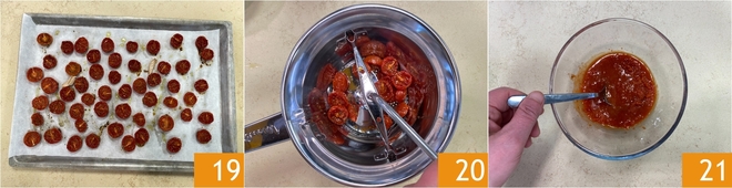 Dès que les tomates cerises seront prêtes, sortez-les du four, retirez l’ail et laissez-les tiédir 19. À ce stade, transférez-les dans un passe-légumes 20 jusqu’à obtenir une sauce 21.