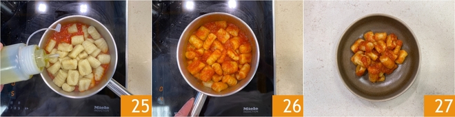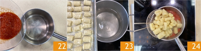 Versez-la dans une petite casserole et réchauffez la sauce 22. Portez à ébullition une grande casserole d’eau salée et faites cuire les gnocchis 23 : ils sont prêts lorsqu’ils remontent à la surface, cela prendra quelques minutes. Égouttez les gnocchis et transférez-les directement dans la poêle avec la sauce 24.