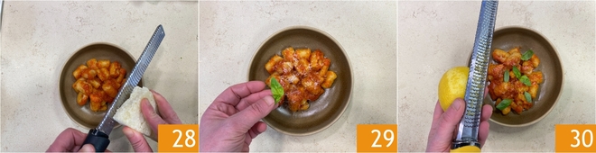 Complétez avec du pecorino râpé 28, quelques feuilles de basilic 29 et du zeste de citron râpé 30. En alternative au zeste de citron, utilisez une pincée de poudre de citron brûlé, qui donnera au plat une note aromatique intense et originale. Servez vos gnocchis bien chauds !