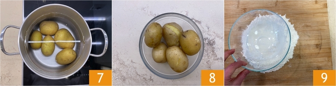 En attendant, occupez-vous des gnocchis. Rincez les pommes de terre sous l’eau courante et faites-les cuire en commençant à l’eau froide 7. Cela prendra environ 30–40 minutes selon la taille. Lorsqu’elles seront tendres, égouttez-les 8. Disposez la farine sur un plan de travail et créez la classique fontaine en écrasant la farine avec le fond d’un bol ou en la poussant avec les mains.