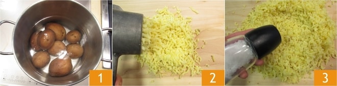 Pour préparer les gnocchis cacio e pepe avec des artichauts croquants, placez les pommes de terre dans une grande casserole avec beaucoup d'eau froide 1. Il faudra les faire bouillir : quand elles commencent à bouillir, comptez 30-40 minutes de cuisson. Pour savoir si elles sont cuites, piquez-en une avec les dents d'une fourchette et si vous pouvez atteindre le cœur, vous pouvez alors les égoutter. Écrasez-les encore chaudes sur un plan de travail : si vous utilisez un presse-purée, il ne sera pas nécessaire de les éplucher, la peau restera à l'intérieur de l'ustensile. 2. Écartez-les légèrement pour créer un puits au centre, ajoutez une pincée de sel 3.