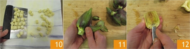 en les plaçant au fur et à mesure sur un plateau recouvert d'un torchon fariné de semoule, pour éviter qu'ils ne collent entre eux 10. Consacrez-vous à la préparation des chips d'artichauts : dans une poêle à bords hauts, faites chauffer l'huile pour friture à feu moyen. Nettoyez les artichauts en portant des gants ou en vous frottant les mains avec du jus de citron, pour éviter qu'ils ne s'assombrissent. Retirez les feuilles externes les plus fibreuses 11, coupez-les en deux et enlevez également la barbe intérieure 12.