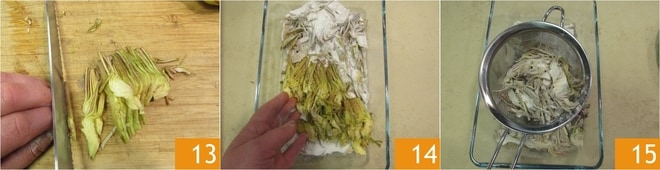 Coupez-les ensuite dans la longueur, en tranches très fines 13. Passez-les dans la farine de riz 14, en vous assurant qu'elles soient bien enrobées, puis placez-les dans une passoire pour secouer l'excédent de farine 15.