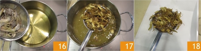Quand l'huile aura atteint 180°, commencez à frire les artichauts peu à la fois 16 pendant 3-5 min ou jusqu'à ce qu'ils soient dorés 17. Une fois prêts, égouttez-les sur du papier absorbant 18, en prenant soin de ne pas trop les superposer et salez-les immédiatement. Laissez-les de côté et si vous le souhaitez, vous pouvez les garder tièdes au four à 130°, en mode statique.