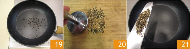 Pour la cuisson des gnocchis et la sauce, commencez par porter à ébullition une casserole d'eau. Une fois à ébullition, salez-la légèrement moins que d'habitude, car le pecorino est déjà très salé. Pendant ce temps, dans une poêle très large, faites griller les grains de poivre pendant quelques minutes à feu moyen 19 : quand vous sentirez leur arôme se dégager, retirez-les du feu et écrasez-les grossièrement dans un mortier, ou avec un pilon 20. Gardez quelques grains entiers de côté pour la décoration. Remettez les grains écrasés dans la poêle et chauffez à feu moyen 21.
