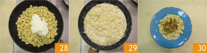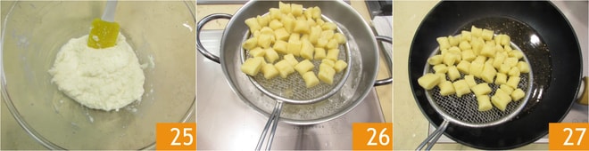 Mélangez pour obtenir une pâte assez dense, d'une consistance similaire à celle d'un pâté 25. Quand les gnocchis remontent à la surface, égouttez-les 26 directement dans la poêle avec le poivre 27, mélangez délicatement, puis éteignez le feu.